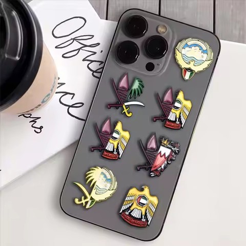 特注サウジアラビア金属チャームステッカー携帯電話用UV耐性漫画ロゴレーザーメッキプロモーションバッジ